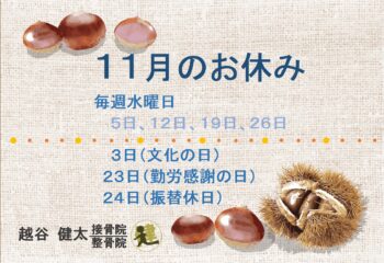 13日(スポーツの日)は祝日ですが、9:00~12:00、15:00~20:00で営業いたします。 18日(土)は誠に勝手ながらお休みさせていただきます。 ご不便をおかけしますが、よろしくお願いいたします。